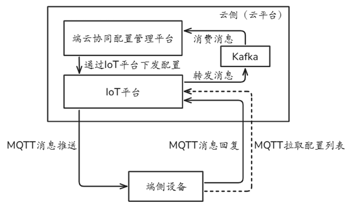 配置文件推送更新:支持向端侧设备主动下发配置文件信息,端云协同配置管理平台通过使用IoT平台的消息发送接口,经由MQTT通道向端侧的在线设备批量推送更新。