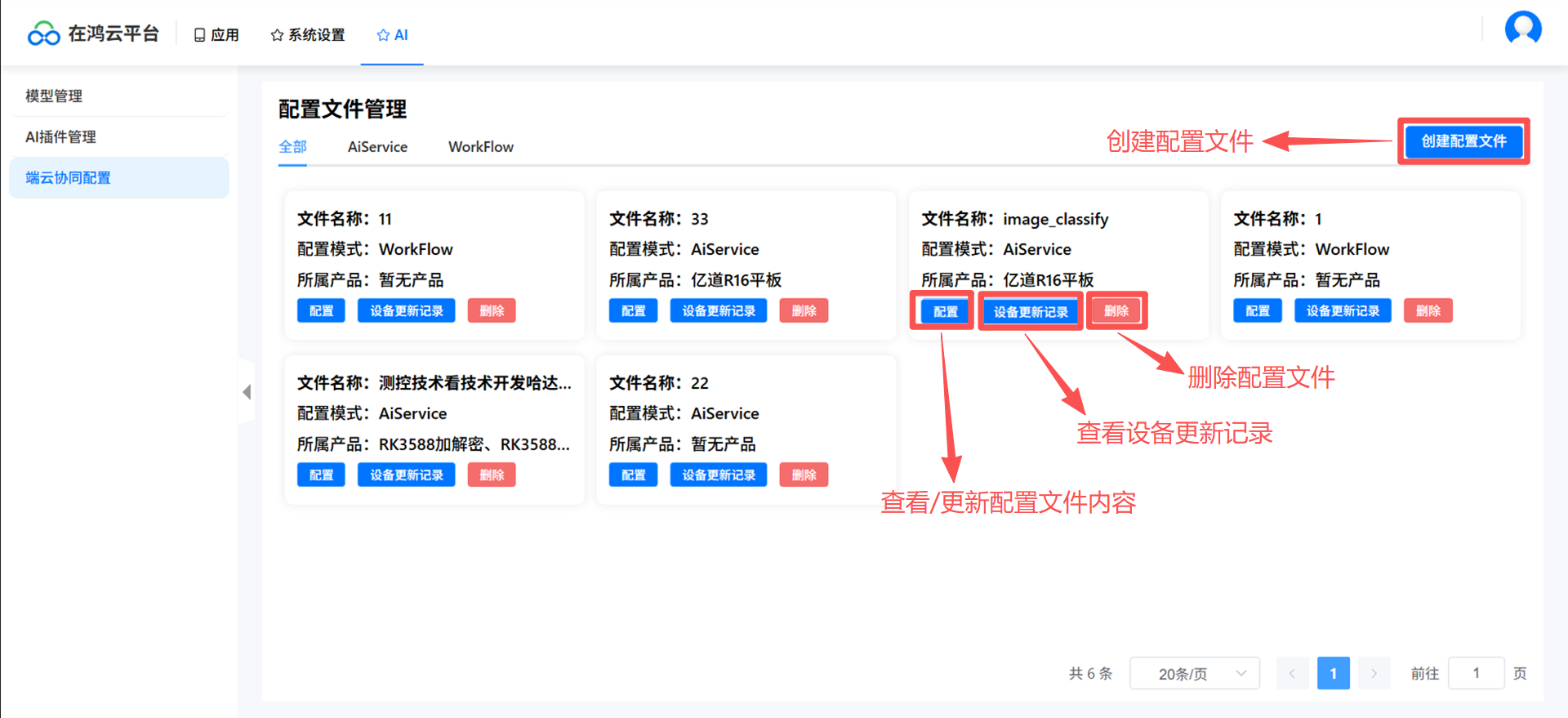 登录云平台,进入端云协同配置页面,选择配置文件,点击删除按钮。