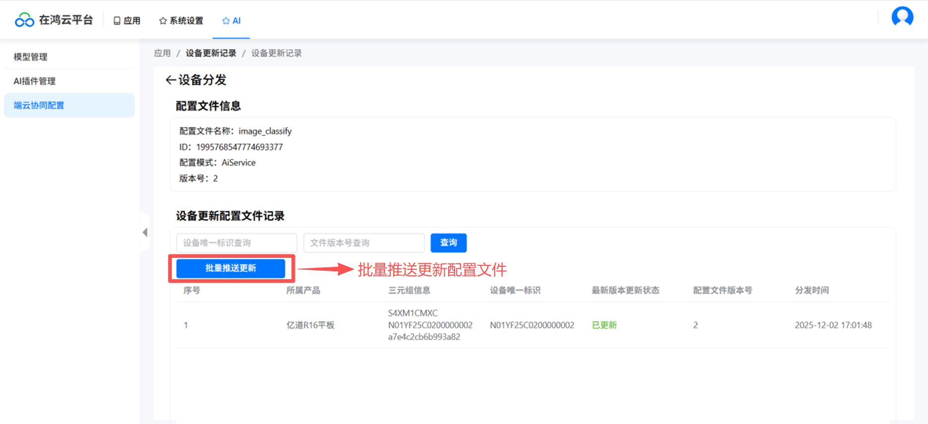 登录云平台,进入端云协同配置页面,选择需要下发的配置文件,点击设备更新记录按钮进入设备分发页面,点击批量更新按钮,完成配置下发。