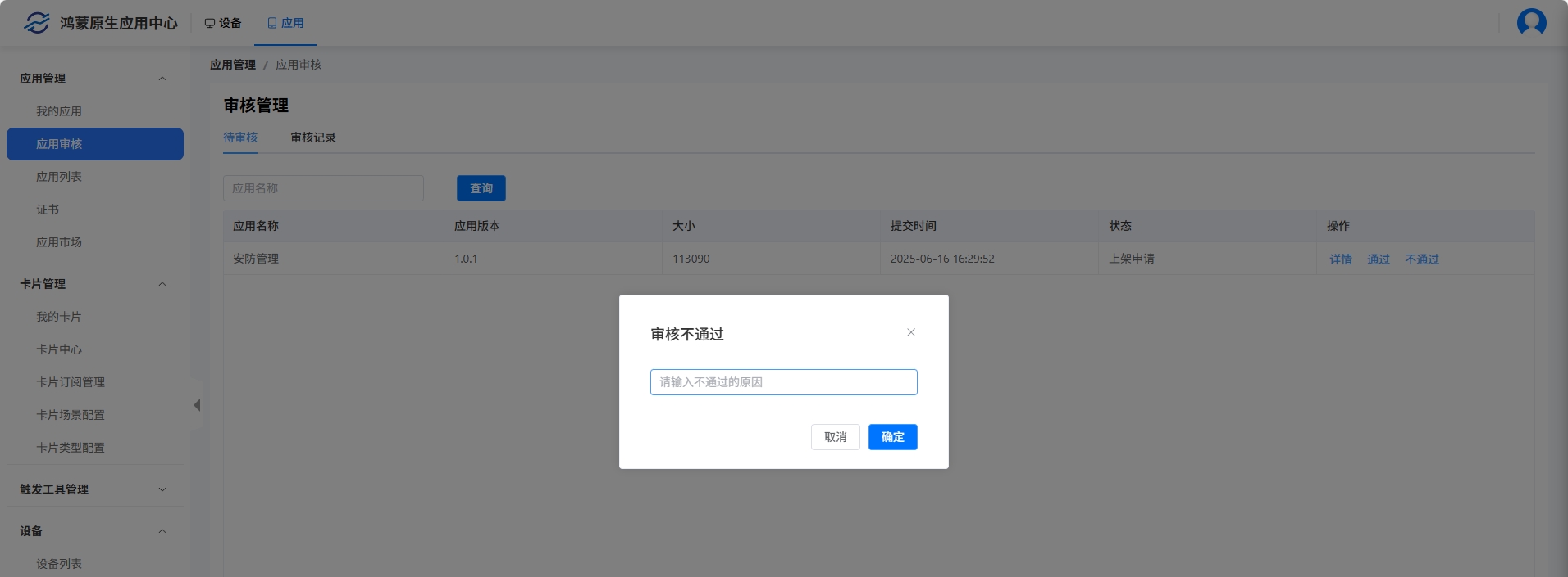 当开发者发布应用上架申请后,管理员可对应用进行审核。