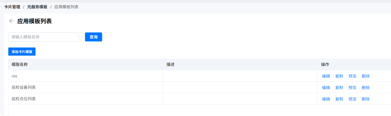 登录应用管理平台后,将鼠标移至左侧菜单,依次点击“卡片管理” -> “元服务模版”,即可进入列表展示页面。如下图所示: