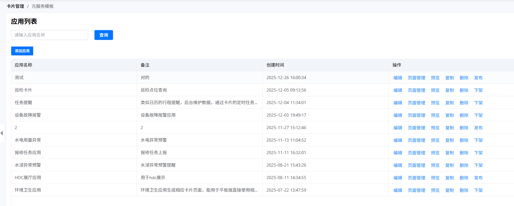 选中某条记录,点击操作栏下面的“页面管理”,进入到元服务卡片的管理页面。如下图所示: